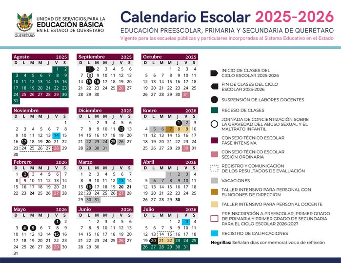 La Secretaría de Educación del Poder Ejecutivo Estatal en un trabajo conjunto con la Unidad de Servicios para la Educación Básica en el Estado de Querétaro (USEBEQ), realizó ajustes al calendario escolar de 185 días para el ciclo lectivo 2025-2026, dado a conocer el pasado 9 de junio por la Secretaría de Educación Pública Federal (SEP).