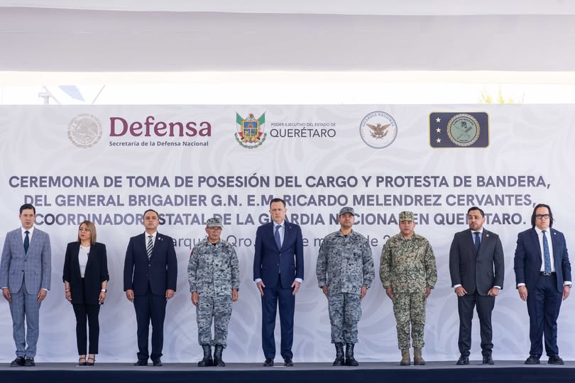 El titular del Poder Ejecutivo estatal, Mauricio Kuri González, estuvo presente en la toma de posesión al cargo y protesta de bandera del general Ricardo Melendrez Cervantes, quien asumió el puesto como coordinador estatal de la Guardia Nacional en Querétaro.