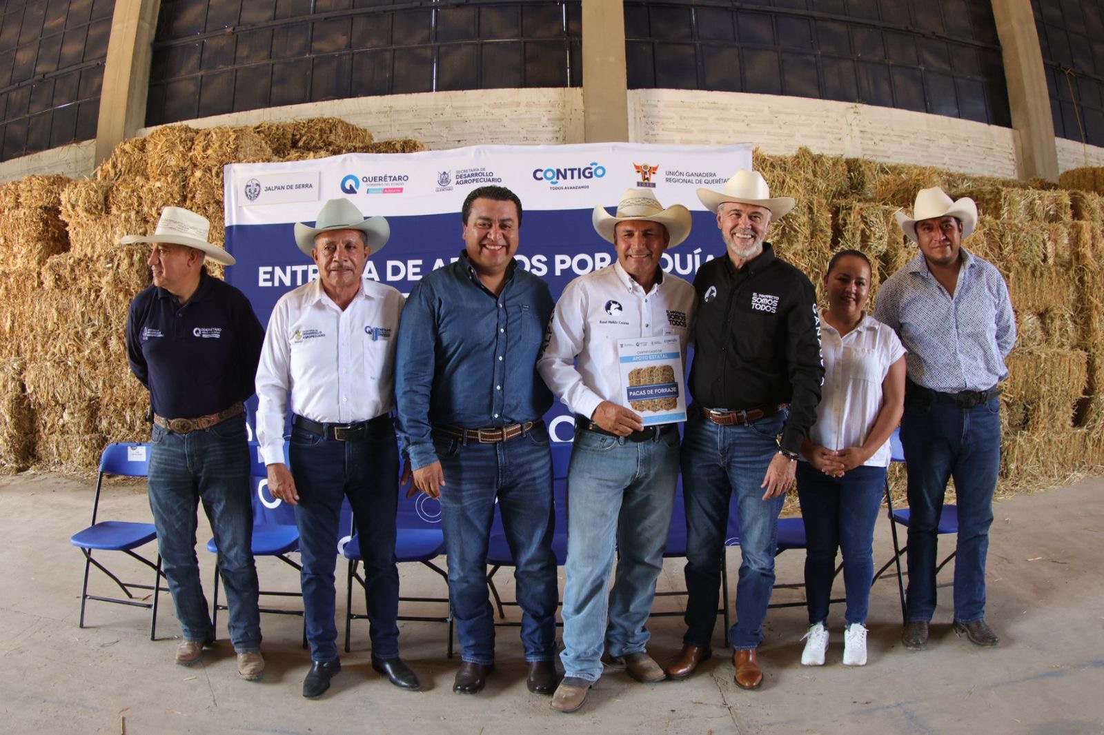 El secretario técnico de la Secretaría de Desarrollo Agropecuario, José González, encabezó en el municipio de Jalpan de Serra la entrega de alimento para ganado, como parte del programa de apoyo por sequía a ganaderos de pequeña y mediana escala en la Sierra. El recurso permitirá otorgar tres mil pacas de forraje y mil 680 bultos de alimento concentrado a ganaderos de la cabecera municipal, Valle Verde y Tancoyol, beneficiando a un total de 245 productores pecuarios.