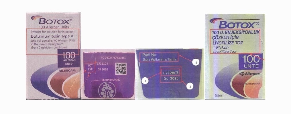 Por otro lado, COFEPRIS recibió la notificación de otra agencia internacional informando sobre la detección del producto BOTOX 150 U (Toxina Botulínica Tipo A), solución inyectable, con el número de lote C3709 C3 y fecha de caducidad 12/2025. Sin embargo, es importante señalar que en la alerta del 30 de mayo de 2023, sobre la falsificación de BOTOX 100 U (Toxina Botulínica Tipo A), solución inyectable, fue incluido el mismo número de lote C3709C3, pero con fecha de caducidad 07/2023, por lo cual se observa que el número de lote fue utilizado para diferentes presentaciones (100 U y 150 U) y la fecha de caducidad fue adulterada.