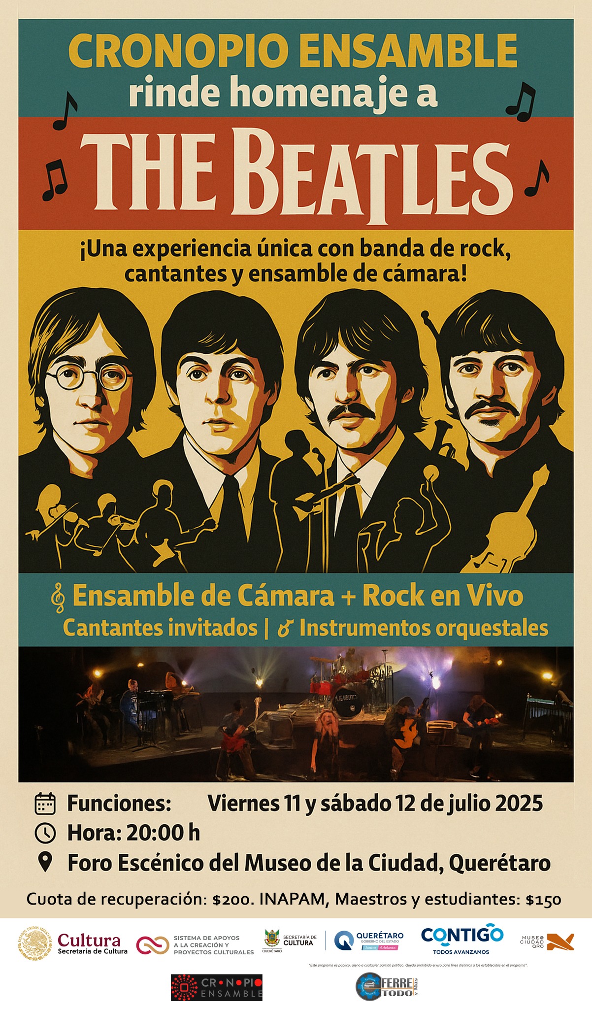 El Museo de la Ciudad de Querétaro, de la Secretaría de Cultura del estado, será escenario para el Homenaje a los Beatles que Cronopio Ensamble ofrecerá los días viernes 11 y sábado 12 de julio, veladas que prometen ser una celebración respetuosa, renovada y luminosa de la música del cuarteto de Liverpool, fenómeno cultural y artístico que sigue vigente.