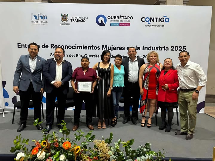 La secretaria del Trabajo (ST), Liliana San Martín Castillo y el presidente de la Asociación de Industriales de San Juan del Río, Jesús Herrera García, realizaron la entrega de reconocimientos “Mujeres en la Industria 2025”, con el objetivo de destacar el esfuerzo, liderazgo y trayectoria de mujeres trabajadoras del sector industrial en el municipio de San Juan del Río.
